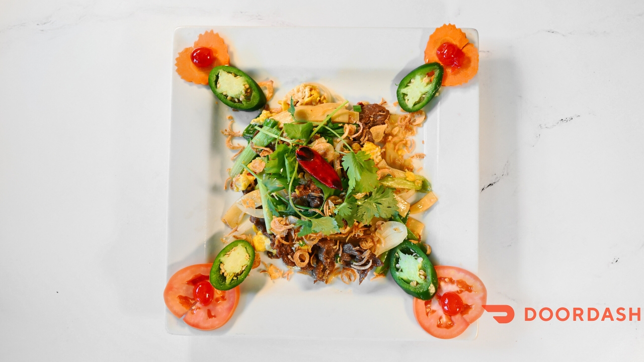 Beef marinated with House vinaigrette, mixed with lettuce, bean sprouts, mint, cilantro, carrots topped with roasted peanuts.
