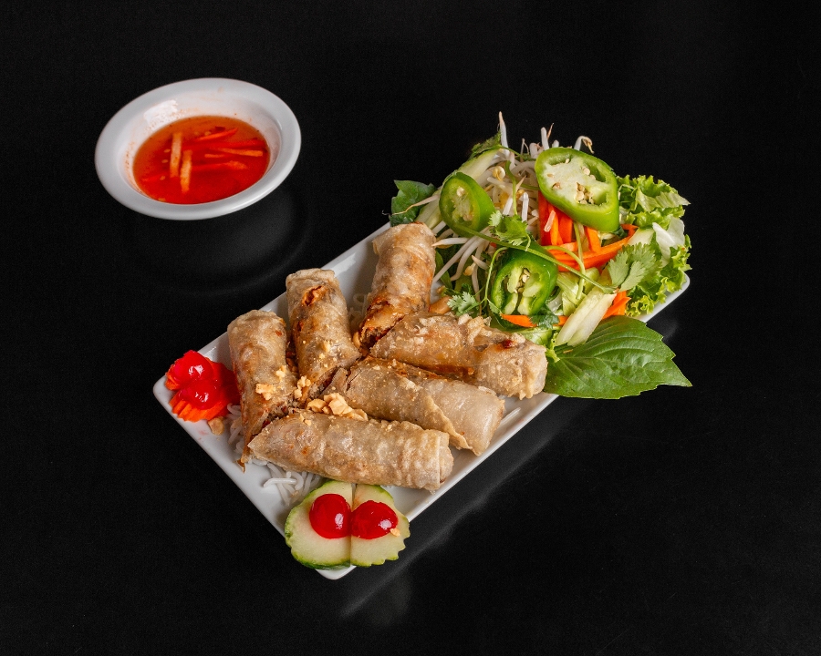 (3) crispy egg rolls - peppered pork & vermicelli noodles served with cucumbers, bean sprouts, peanuts, carrots, lettuce, cilantro, jalapeno, mint & the House sauce.